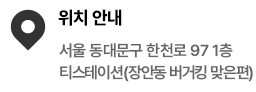 서울 동대문구 한천로 97 1층 티스테이션(장안동 버거킹 맞은편). Tel : 010-6835-3485